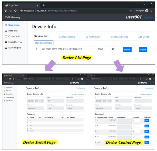 Figure 12 shows the implementation result of edge client that presents the information of an IoT device. The information is delivered from the EdgeX core through the Internet. For presenting the device information to users, the client shows the list of retrieved devices that are deployed in the same network with the edge gateway. Once an item is selected by a user, then the client shows detailed information of the selected device, and the page includes a link to the detail control page for sending commands to the IoT device.