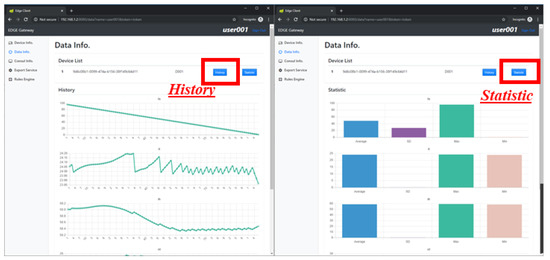 The proposed entities are deployed in the corresponding platform to provide functions as shown in Figure 7. The edge client is a web client that provides the information through UIs to users as well as receiving the information from users and delivering it to the edge gateway. In the experiment, the Chrome web browser runs the edge client on a laptop to access the edge gateway through the Internet. The UIs are provided by the client service provider from the edge gateway. Bootstrap and jQuery libraries are used for implementing the contents of UIs based on the Spring Boot framework.