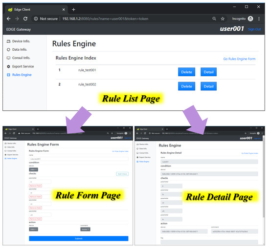 Figure 14 shows the implementation result of rules management in the edge client. A rule can be uploaded by a client through the edge client. The rule is deployed in the edge gateway to operate the intelligent scenario once the rule is triggered by the published event. For managing rules in the proposed edge computing, the edge client provides list, form and detail pages for retrieving and uploading rule information. The rule list page provides a list of retrieved rules that are uploaded by users through the rule form page. The rule form page provides a form for filling the information of a new rule, and through the client service provider, sends this to the rules engine, which converts the rule information to a Drools file. Detailed information of a rule is retrieved from the client service, which saves the rule information when the rule is uploaded.