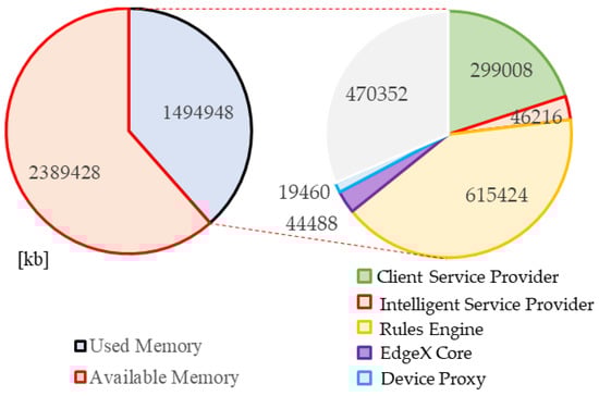 For evaluating the performance of computational resources, the memory usage of the proposed edge gateway on the Raspberry Pi 4 is presented in Figure 15. The total memory of the device is 3,884,376 kb, in which the run processes take 1,499,948 kb. The device runs the proposed modules to provide the dynamic inference approach in intelligent edge computing. However, the memory ability is sufficient for running these processes. In the running processes, the edge gateway takes 1,024,596 kb, and 470,352 kb is used for other processes, including running the OS. The rules engine and client service provider modules use the most memory. Both modules are developed in Java to provide web services. Therefore, the Java applications based on Java Virtual Machine (JVM) use more memory. Increasing the rules in the rules engine does not increase the memory usage of the module. The intelligent service provider takes 46,216 kb for providing intelligent approaches based on the TensorFlow lite model. The memory usage is not increased by increasing the count of the model in the intelligent service provider. The EdgeX core runs on the Docker container, which is developed in Go to provide microservices through consuming 44,488 kb of memory. The device proxy is also developed in Go to provide services that use 19,460 kb of memory. According to the experiment, Go-based modules use less memory than Java-based modules, while they provide more functions through microservices.