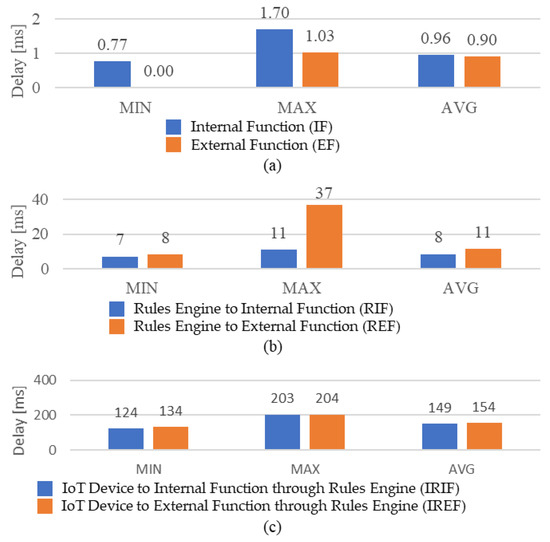 Figure 17b presents delays for invoking the intelligent function from the rules engine. RIF means invoking the internal intelligent function and REF means invoking the external intelligent function. The average latency shows the REF takes more time than the RIF. Although the EF takes less time for operating the intelligent function, the overall process for invoking the intelligent function through microservices takes more time because of the network delay. Figure 17c presents delays for the process, which includes event publishing of IoT device, rule activation in the rules engine, invoking the intelligent function of the intelligent service provider and sending the command to IoT device. IRIF means the experiment with the internal intelligent service provider support and IREF means the experiment with the external intelligent service provider. Through this experiment, deploying the intelligent function in the edge gateway takes less latency even when the edge gateway is deployed in a small machine with a constrained specification.