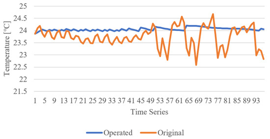 Figure 19 shows the temperature data comparison between the experimental result and the original user data. The indoor temperature is updated by the heater that is operated by the edge gateway. Using the building user data, the model is developed for the indoor environment. Therefore, the temperature is similar to the original data. However, the operating temperature is kept at 24 degrees Celsius. The reason for this is that the model is configured to control the heater to always keep the indoor temperature higher than 24 degrees Celsius. The result of operating heater energy consumption illustrates that the heater sometimes consumes the maximum amount of energy.