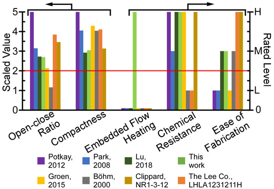 The internal structure of some COTS valves is similar to microfabricated valves; it includes a solenoid actuator, fluidic paths, and a valve membrane (e.g., NIV series from Clippard, Cincinnati, OH, USA, 075T series from Bio-Chem Fluidics, Inc., Boonton, NJ, USA, and LFN series from The Lee. Co., Westbrook, CT, USA). Some other COTS valves do not use a valve membrane, but instead use an elastomer plunger head that is directly attached to the actuator (e.g., LHL series from The Lee. Co., Westbrook, CT, USA); this approach can present chemical compatibility challenges and also increase dead volume. Microfabricated and COTS valves have both historically lacked embedded flow heaters, presenting challenges for the analysis of heavy and surface-adsorptive chemicals in µGC systems, such as organophosphorus compounds. In order to compare the valves within the context of µGC, the performance can be summarized in five metrics: open-close ratio of flow conductance, ease of fabrication, compactness (which is inversely related to size), chemical resistance, and embedded flow heating. For most µGC systems and other systems where frequent switching of valve is not required, the power consumption and response time are less critical, and, therefore, not compared. In Figure 1, two metrics—open-close ratio of flow conductance, and compactness—that can both be quantitatively evaluated are scaled to a range of 0–5; three other metrics—embedded flow heating, chemical resistance, and ease of fabrication—which can only be qualitatively evaluated, are rated high, medium, or low. The open-close ratio of flow conductance is evaluated based on the actual performance; the compactness is evaluated based on the device volume; ease-of-fabrication is estimated from the lithographic mask count, except for the COTS valve; and, chemical resistance is estimated from the wetted materials. For µGC systems, the microvalve should preferably merit at least a moderate score in each of the five metrics.