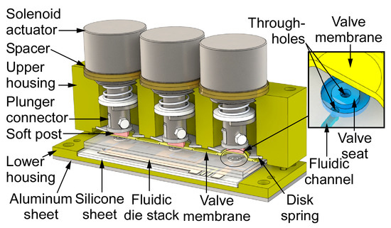 A two-part housing is used in order to accommodate the components with precise alignment. It is 3D printed from Ultem1010® (CIdeas Inc., Crystal Lake, IL, USA) because of the high printing resolution and thermal stability. The upper housing incorporates multiple chambers for the solenoid actuators and disk springs and jigs for alignment to the lower housing, which incorporates a cavity for the fluidic die stack and alignment holes. Nylon spacers are used to adjust the vertical position of the actuators and, consequently, the actuator displacement. The fluidic die stack is seated within the cavity on a 500 µm-thick silicone cushion to absorb shock. In addition, a 1.5 mm-thick aluminum sheet is attached beneath the lower housing for mechanical rigidity and robustness. Screws and nuts are used to fasten the upper and lower housing. The size of the assembled device is 5.3 × 1.7 × 4.5 cm3 (Figure 4b).