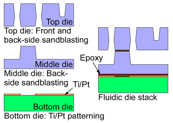 The die stack fabrication process. The valve seats, fluidic microchannels, and through-holes are created by a two-mask sandblasting process. The Ti/Pt layer is patterned while using another mask. Three dies are bonded into a stack to form the fluidic die stack.