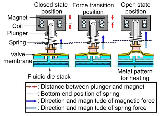 The operation of the microvalve can be explained by the separation between the plunger and the latching magnet, and by the compression of the spring (Figure 5). When the microvalve is in its closed state, the spring is moderately compressed, and it maintains a spring force against the fluidic die stack. When the solenoid actuates the plunger, pulling it toward the magnet, the compression of the spring increases, but the attractive force from the latching magnet increases more rapidly. At the force transition position, the spring force and magnetic force are balanced. When the microvalve is in its open state, the magnetic force dominates over the spring force, and it latches the microvalve, even when the solenoid is turned off. To open the microvalve from the closed state, a positive 12 V, 0.9 A pulse is applied to the solenoid for 25 ms. A negative 12 V, 0.9 A pulse is applied for 25 ms in order to close the microvalve from the open state. The spring (CCF-0600-0013-M, The D.R. Templeman Co., Plainville, CT, USA) provides a displacement of 560 µm and a blocking force of 2.8 N.