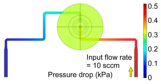 The flow resistance of the microvalve in the open state was estimated by finite element analysis (FEA) while using COMSOL Multiphysics software. The simulated structure represented the gas flow path of the middle valve in Figure 1, i.e., it included two microchannels, the valve seat, and the valve membrane region. The height of the microchannels was assumed to be 425 µm, and the sidewall taper was represented. The height of the valve membrane region, which is determined by the actuator displacement, was assumed to be 560 µm.