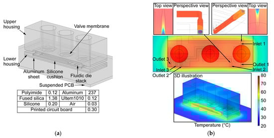The thin-film heater and thermistor allow the microvalve to be compatible with surface-adsorptive chemical species. The thermal characteristics of the valve were simulated by FEA while using COMSOL Multiphysics software. The simulated structure (Figure 7a) included the entire lower housing and its contents, as well as the upper housing; for simplicity, the simulated structure excluded the actuators, plunger connectors, and soft posts, all of which contributed to negligible heat conduction from the heated fluidic die stack because of the low thermal conductance and small contact area of the soft posts. The empty space in the microvalve module was modeled as air. Additionally, the microvalve module was assumed to be located on a suspended printed circuit board (PCB), thus allowing natural air convection on all of the exterior surfaces. The convective heat transfer coefficients were computed within COMSOL based on the configuration and characteristic lengths of the exterior surfaces.