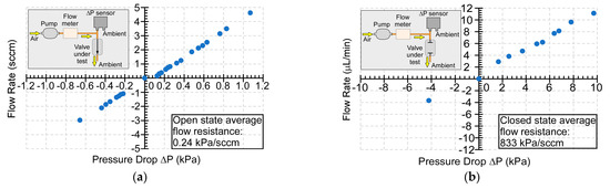 (a) Flow characteristics for an open microvalve. (b) Leakage characteristics for a closed microvalve. The test setup for each case is shown in the insets.