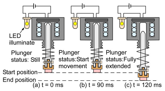Dynamic response of the microvalve. (a) At 0 ms, the light emitting diode was turned on, confirming the passage of electric current. (b) At 90 ms, the plunger started to move. (c) At 120 ms, the plunger reached the end position.