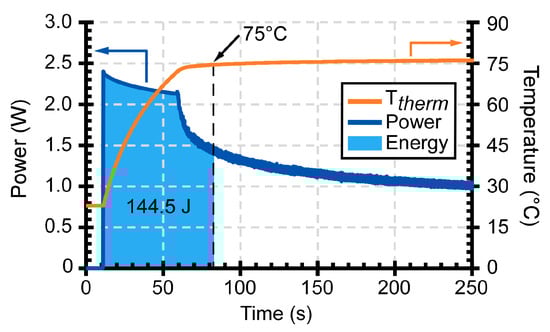 The energy and power consumption of the microvalve module during heating. The microvalve was heated to and maintained at 75 °C under servo control.
