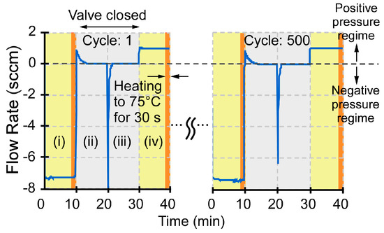 Extended lifetime was tested by cyclical operation. During each testing cycle, the microvalve was tested with bidirectional flow in open and closed states. The testing conditions included four stages: (i) microvalve open in the negative pressure regime, (ii) microvalve closed in the positive pressure regime, (iii) microvalve closed in the negative pressure regime, and (iv) microvalve open in the positive pressure regime. In the last 30 s of the open state, i.e., stage (ii) and (iv), the microvalve was heated to 75 °C (Figure 11). The tests revealed a lifetime >500 cycles over a duration of 330 h without any degradation in performance. These results were obtained for the microvalve version that used an aluminum plunger that was attached to the valve membrane with adhesive foam. The microvalve version that used a silicone post provided lower lifetime when heated, because of the failure of the adhesive that was used to bond silicone post to the valve membrane under applied stresses.