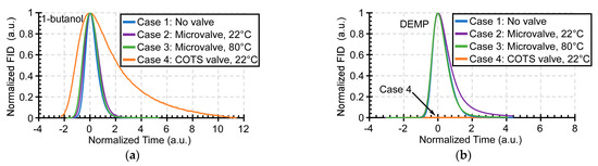 Two chemicals were selected in order to compare these four cases: 1-butanol, representing light polar species, and DEMP, representing heavy polar species. The former is a polar alcohol with a Kovats retention index of 660, whereas the latter is an organophosphorus compound with a Kovats retention index of 975. The responses of the four cases are compared in the normalized peaks that are presented in Figure 13. The FID signal intensity of each case normalized to its peak is plotted against a time axis. The time axis is centered at the peak and ratioed to peak width at half height (PWHH) for Case 1 in order to compensate for run-to-run variation in the test setup [45]. Thus, a Case that provides a PWHH of 2 on this plot represents a peak that is double the width of the reference Case 1, and the overlay of these normalized peaks readily reveals the chromatogram distortion that is attributable to the valve under test (Figure 14).