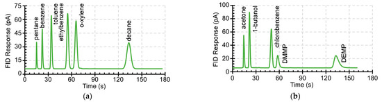 Additional chemicals that were tested in Case 3 included a non-polar mixture (containing pentane, benzene, toluene, ethylbenzene, o-xylene, and decane), and a polar mixture (containing acetone, 1-butanol, chlorobenzene, DMMP, and DEMP). In both chromatograms, which are shown in Figure 14, all of the chemical species eluted in the sequence of their expected retention time [45] and did not show significant peak distortion. Overall, the results showed that the heated microvalve does not retain analytes and, consequently, that the sensitivity of µGC systems that incorporate it will not be affected.