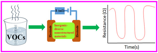 To this path, reviews on analytes quantification by means of electrochemical devices have already been reported by many researchers [44,45]. However, the information regarding the utilization of diverse inorganic-nanostructures in chemiresistor device-based VOCs determination, which is necessary for upcoming researchers, is currently deficient. Therefore, we deliver a comprehensive review on diverse nanostructured semiconducting nanomaterials that has been employed in device-based VOCs quantifications based on recent reports (more than 340 references published since 2016).
