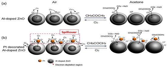 Schematic illustrating the sensing reaction mechanism of (a) Al-doped ZnO (AZO) and (b) Pt-decorated AZO (Pt-AZO) sensors in air and acetone (Reproduced with the permission from Ref. [62]).
