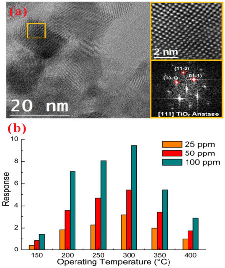 (a) HRTEM micrograph of the 400 °C TiO2-5Rh sample, detail of the orange squared region and its corresponding power spectrum; (b) Comparison between the TiO2-5Rh acetone responses at various operating temperatures. The typical volcano behavior can be observed (Reproduced with the permission from Ref. [69]).