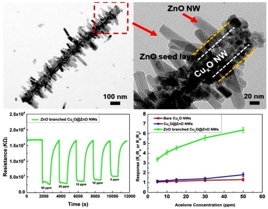 TEM image of ZnO branched p-CuxO @n-ZnO heterojunction nanowires and its sensor responses to acetone (Reproduced with the permission from Ref. [72]).