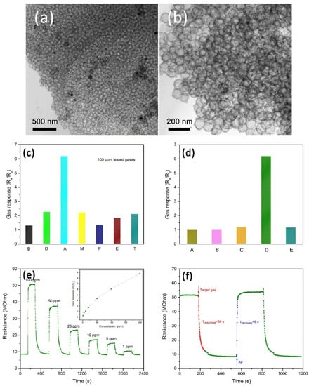 (a,b) The TEM images of Ag@CuO-TiO2 hollow nanocages; (c) Gas responses to 100 ppm various target gases at 200 °C (B, benzene; D, dimethylbenzene; A, acetone; M, methanol; F, formaldehyde; E, ethanol; T, toluene); (d) Gas responses of different compositions to 100 ppm acetone at 200 °C (A–D, A: Ag@CuO; B: TiO2; C: CuO-TiO2; D: Ag@CuO-TiO2) and 375 °C (E: TiO2) (e) Responses vs. acetone concentrations at 200 °C; (The inset figure is the linear relationship between response and concentration) (f) Response and recovery curves to 100 ppm acetone at 200 °C (Reproduced with the permission from Ref. [107]).