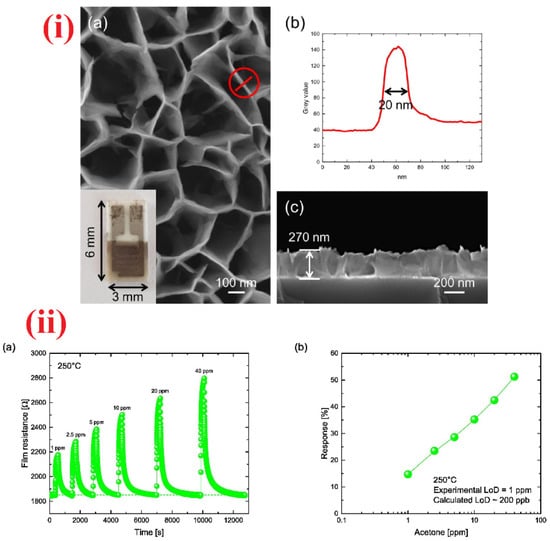 (i) (a) Plan-view SEM image of the NiO nanowalls (the inset shows the NiO-based sensor), (b) grey value profile along the line perpendicular to the nanosheet marked with the red circle, and (c) cross-view SEM image of the NiO nanowalls; (ii) (a) Dynamic responses of the NiO-based sensor to acetone pulses in the concentration range 1–40 ppm at 250 °C and (b) calibration curve at 250 °C (Reproduced with the permission from Ref. [115]).