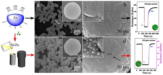 (a–d) Schematic representation of solvothermal synthesize, SEM images and sensory response of of NiO/ZnO hollow spheres towards acetone (Reproduced with the permission from Ref. [122]).