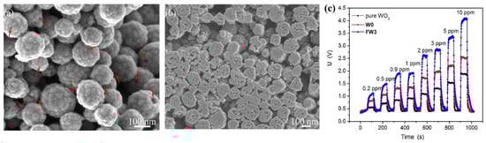 - Han, Y.; Liu, Y.; Su, C.; Chen, X.; Zeng, M.; Hu, N.; Su, Y.; Zhou, Z.; Wei, H.; Yang, Z. Sonochemical synthesis of hierarchical WO3 flower-like spheres for highly efficient triethylamine detection. Sens. Actuators B 2020, 306, 127536. [Google Scholar] [CrossRef]