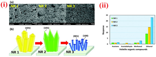 (i) (a) FESEM images of PVA–ZnO nanocomposites calcined at 873 K for different time durations—1 h (NR1), 3 h (NR2), and 6 h (NR3) and (b) schematic of the ZnO nanorods (NR1, NR2, and NR3); (ii) Sensing responses of the calcined samples towards 100 ppm of acetone, acetaldehyde, methanol, and ethanol at room temperature (299 K) (Reproduced with the permission from Ref. [169]).
