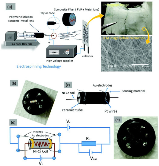 (a) A diagram of the electrospinning process with a photograph of as-spun fiber mat and SEM image of composite fibers before calcination treatment. (b,e) Photographs of the sensor without and with covering by sensing materials, respectively. (c) Schematic diagram of the sensor and its components. (d) A schematic of the sensor circuit and its elements (Reproduced with the permission from Ref. [179]).