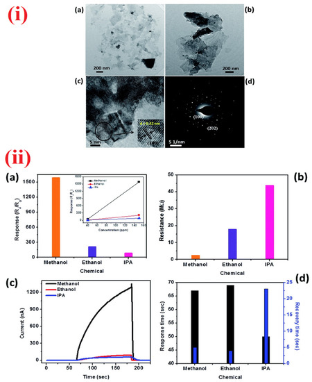 (i) TEM analysis of SnS2 nanoflakes (a and b) low magnification TEM images, (c) high resolution TEM image and (d) selected area diffraction (SAED) pattern; (ii) Alcohol sensing performance of SnS2 nanoflakes (all alcohols at 150 ppm) at 25 °C (a) response vs. alcohols and inset shows the response vs. concentration, (b) resistance vs. alcohols, (c) typical I–t plot and (d) bar diagram of response and recovery time of the test alcohols (Reproduced with the permission from Ref. [197]).