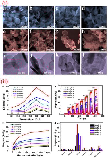 (i) SEM images of Sample 1–4: (a–d) before calcination; (e–h) after calcination; TEM images of Sample 1–4 after calcination (i–l); (ii) (a) The response of samples to 100 ppm ethanol at different operating temperature; (b) the response and recovery curves of samples upon exposure to 10–1000 ppm ethanol; (c) the response curves of samples to ethanol concentrations; (d) the linear relationship of log(S-1)-log(C) plot to ethanol at the optimum operating temperatures (Reproduced with the permission from Ref. [200]).