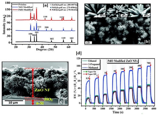 (a) X-ray diffraction patterns of the synthesized pristine ZnO NFs, NiO modified ZnO NFs, and PdO modified ZnO NFs. (b) FESEM image of pristine ZnO NF; inset shows magnified view of (i) pristine, (ii) NiO modified and (iii) PdO modified ZnO NF. (c) Cross-sectional view of grown ZnO NF on Si/SiO2 substrate. (d) Transient response characteristics (response magnitude (%) as a function of time) of the PdO–ZnO NF hybrid structure towards methanol, ethanol, and 2-propanol in the concentration range of 0.5–700 ppm at 150 °C (Reproduced with the permission from Ref. [208]).