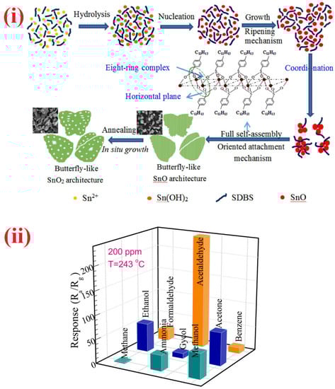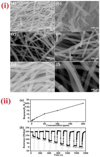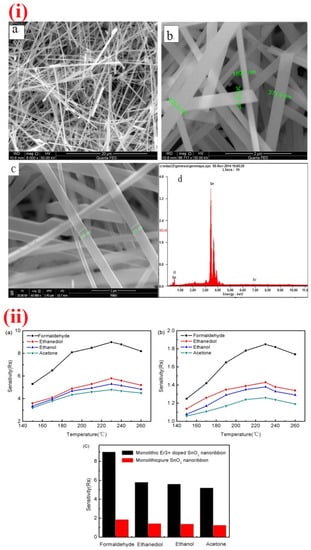 (i) SEM images of Er–SnO2 nanobelts (a) at a low magnification, (b) at a high magnification, (c) SEM image of pure SnO2 nanobelts, and (d) EDS spectra of Er–SnO2 nanobelts; (ii) (a) The responses (Rs) versus temperature (T) of Er–SnO2 nanobelt to 100 ppm gas from 150 °C to 260 °C, (b) The responses (Rs) versus temperature (T) of SnO2 nanobelt to 100 ppm gas from 150 °C to 260 °C, (c) Histogram of the sensitive responses at 230 °C (Reproduced with the permission from Ref. [258]).