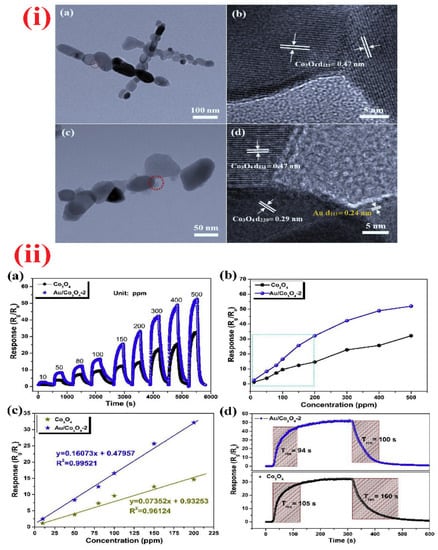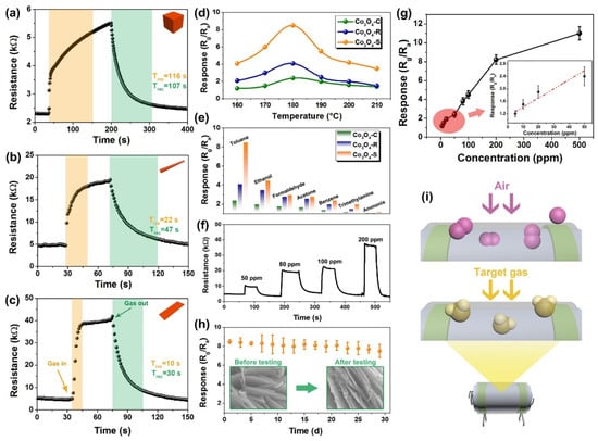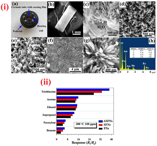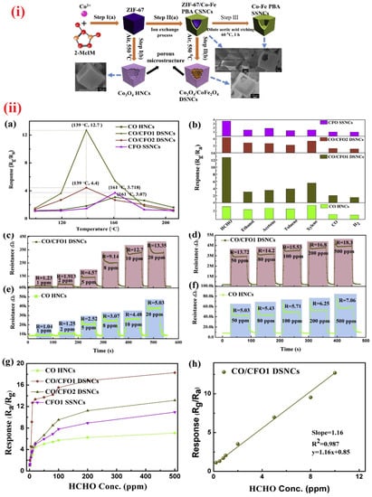 (i) Schematic of the process to fabricate porous Co3O4 HNCs, CCFO DSNCs, and CFO SSNCs; (ii) (a) Responses of the sensors to 10 ppm of formaldehyde at 80–230 °C. (b) Responses of the sensors to 10 ppm of various gases at the optimal operating temperatures. Dynamic response–recovery curves of the CCFO DSNCs and Co3O4 HNCs sensors to xylene in the ranges (c,e) 1–20 ppm and (d,f) 50–500 ppm under their optimal operating temperatures. (g) Response of the sensors in the ranges from 1 to 500 ppm of xylene. (h) Responses of the CCFO DSNCs sensor as a function of low formaldehyde concentration (1–10 ppm) (Reproduced with the permission from Ref. [262]).