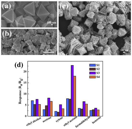 Nanocube-shaped materials were consumed in the quantification of HCHO vapor at diverse operating temperatures. Multi-shelled hollow nanocubes (ZnSnO3 and ZnSn(OH)6; synthesized by co-precipitation method) were engaged in HCHO sensing at 220 °C and 60 °C, respectively [260,261]. The responses reached 37.2 and 56.6 (for 100 ppm; response/recovery time = 1 s/59 s and 1 s/89 s, respectively) with the LODs of <10 ppm and 1ppm, correspondingly. Both materials performed remarkablely in HCHO sensory studies. Similarly, MOF (zeolite imidazolate framework-67; ZIF-67)-derived Co3O4/CoFeO4 double-shelled nanocubes were utilized in the detection of HCHO [262]. As illustrated in Figure 15, the ZIF-67-derived Co3O4/CoFeO4 double-shelled nanocubes were synthesized by MOF route and found to be more effective in the sensing of HCHO even at 1 ppm concentration.