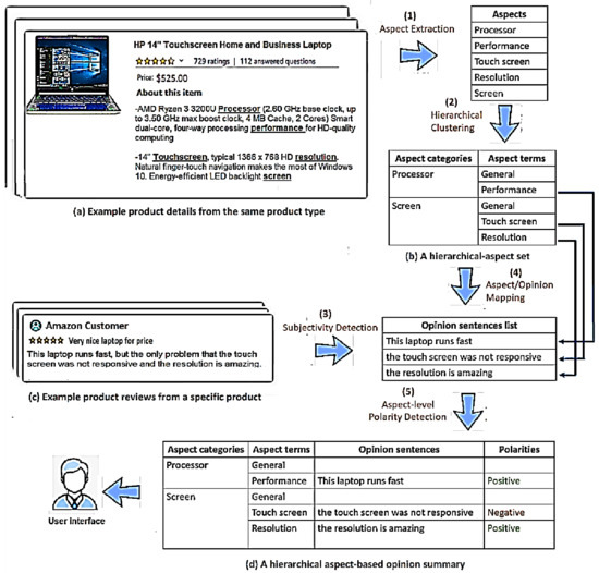 Hierarchical aspects-based opinion summarization is a challenging problem [16], especially when an aspect hierarchy is provided manually (i.e., a predefined structure) [13] or a large amount of training data are needed for a summary presentation [17]. These problems mean the current hierarchical AOS approaches are not scalable. Thus, this paper proposes an automated approach called SEOpinion that extracts popular aspects from the product details (i.e., the templates of the websites) in a hierarchical structure and classifies the opinionated sentences (from customer reviews) according to their aspects. Our proposed approach includes five main tasks (see Figure 1). In the first task, the aspects are extracted from a set of products (e.g., HP, Dell, and Apple) of the same product type (e.g., laptop), as shown in Figure 1a. The second task constructs an aspect hierarchy using the extracted aspects. The third task extracts opinionated sentences from the product reviews. The fourth task automatically maps the aspects in the hierarchy to extracted opinion sentences. For instance, the opinionated sentence “This laptop is ok for its price” matches the aspect “price.” The fifth task classifies the sentiment polarity (positive or negative) of each opinionated sentence associated with its aspect to be ready for summarization.