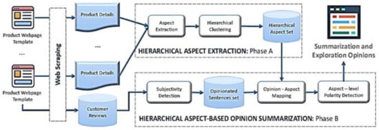 The general structure of our SEOpinion system is given in Figure 2. The system takes a set of product web page templates (each template has product details and customer reviews) of the same product type as input and generates a set of summaries for these products as output. The SEOpinion system is split into web scraping and two other main phases: hierarchical aspect extraction (HAE) and hierarchical aspect-based opinion summarization (HAOS). In the web-scraping phase, the product details and reviews are crawled from EC websites. After that, in the HAE phase, the popular product aspects are extracted from the product details of the same type and then stored in a hierarchical format, as shown in Figure 1b. In the HAOS phase, opinions are first extracted from reviews for each product separately. After that, these opinions are mapped to the hierarchical-aspect set. Furthermore, the polarity of each one is classified (i.e., positive or negative) according to the aspect associated with it, as shown in Figure 1d.