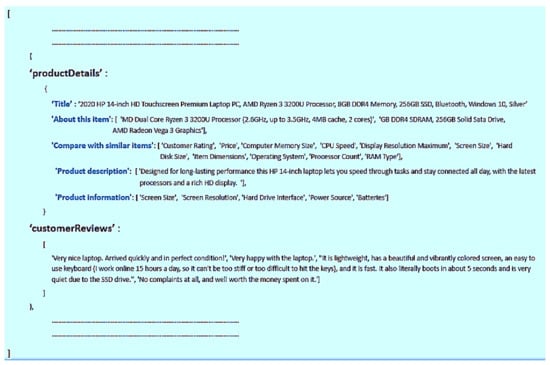 The authors of this paper used the Scrapy (https://docs.scrapy.org/en/latest/) python package, as in [27,28], to create the web scraper. Scrapy was designed to scrape the web content from websites that are composed of many pages of similar semantic structures (i.e., the templates of web pages). Scrapy stands out from other scraping tools (e.g., Selenium and Apify) because it is faster, uses parallel processing, and can deal with structured data and open-sources. The steps to create our scraper are summarized as follows. First, the web scraper visits publicly available web pages that contain product details and reviews. Then, it receives HTML (Hypertext Markup Language) data back from the web server, in which the content of the web pages is embedded. After that, Scrapy extracts the useful-data parts from the HTML using the XPath format. The code snippet “response.xpath(‘XPath Format’).getall()” is used to scrape data from several EC websites using the information from Table 1 to know the XPath format structure of the top five EC websites. Finally, our scraper stores these data in a JSON (JavaScript Object Notation) file. Each JSON file contains an array of JSON objects in which each object consists of two properties (as shown in Figure 3), namely “productDetails” and “customerReviews.” On the one hand, the property “productDetails” has the element of “title” and a set of “useful-data parts,” according to each EC website. The “title” element has the name of the product itself. “Useful-data parts” have the extracted parts of the EC website, as shown in Table 1. On the other hand, the property “customerReviews” has an array of the review text.
