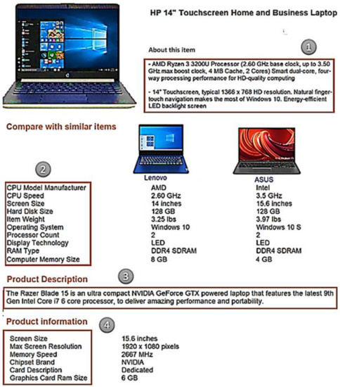 Web scraping is a technique used to fetch data from websites using web scrapers/crawlers. Web scrapers are scripts that use the HTTP (Hypertext Transfer Protocol) to connect to the World Wide Web (WWW) and allow users to retrieve information. Therefore, our web scraper was built to collect product information from EC websites (there are two types of information in these sites, namely product details and customer reviews). In creating the scraper, we faced three main challenges. First, generalizing websites is challenging because the templates vary from site to site. Second, web page structures are constantly updated by web developers. Hence, it is difficult to rely on a single scraper for a long time. Third, the structure of the same website may differ from one category to another. For example, on the Amazon website, the structure of the electronic category is different from the structure of the book category in the template format. To address the above-mentioned challenges, we followed the continuous development and integration of a specific domain on EC sites using the XPath query language. XPath contains the path of any element located on the web page, which is simple, powerful, concise, and easy to get. Table 1 shows the recent structure update of the extracted parts from the laptop domain on the top five EC websites using the XPath format.