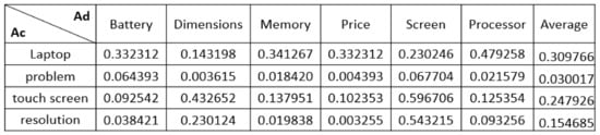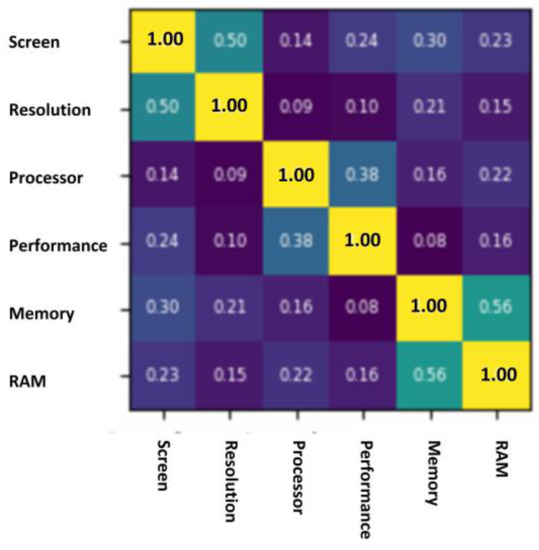 This task clusters a set of product aspects into feature grouping. For example, “resolution,” “screen-size,” and “screen” are not synonymous, but they can indicate the same feature: the screen. The task applies cluster similarity technique-based an unsupervised method, which is encapsulated in the “ClusterSim” function. This function is based on the work of [32], and we mainly used lexical (or WordNet) similarity to extract a more distinct distributive context that exploits a portion of natural language knowledge to aid in clustering. As shown in Figure 6, “screen” and “resolution” have a 50% of lexical similarity; this percentage should be close because both aspects share many vocabularies. Additionally, “processor” is the closest to “performance,” and “memory” is the closest to “RAM”.