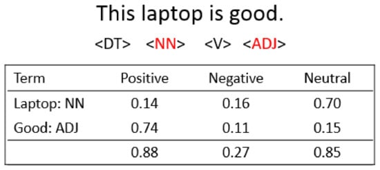 As shown in Algorithm 3, this task extracts a set of opinionated sentences (Oi) from reviews (Ri) of a specific product pi ∈ P. The algorithm iterates through review r ∈ Ri (Loop 2–16). In Step 3, the POS function determines part-of-speech tagging for each sentence s ∈ r using the Stanford Log-Linear POS Tagger [30]. The set of these tagged sentences is designed as ST. Step 4 checks if the tagged sentence (ST) has at least one noun (NN) and one adjective (ADJ), and then a semantic score gives a measure of the number of objective and subjective words in the sentence (Loop 6–11), which is encapsulated in the “SemanticScore” function (Step 7). This function is adopted using SENTIWORDNET [33], where each word contains positive (P), neutral (U), and negative (N) scores for each one to determine subjective words in the sentence. The positive, negative, and neutral scores are summed over all noun and adjective words in the sentence (Steps 8–10) and used to normalize the individual scores for each one. If the sum of a positive and negative scores larger than the neutral score (Step 12), then the sentence is defined as an opinionated/subjectivity sentence. Figure 7 shows an example of computing the normalized score over a noun “laptop” and an adjective “good.” The sentence is subjectivity, in which “good” achieves (0.88 + 0.27) > 0.85. These steps are performed on all sentences of each review to construct a full set of opinion sentences (Oi) for the specific product (pi) (Step 13).