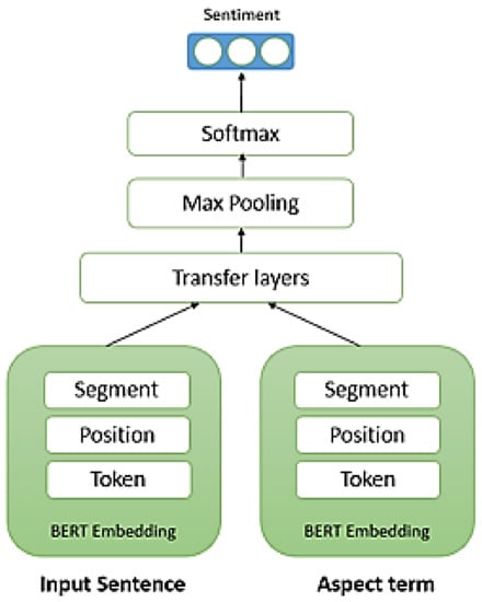 BERT (Bidirectional Encoder Representations from Transformers) is one of the major shifts in new advances in learning contextual representation as more information is provided [5], and it has been widely implemented in sentiment analysis tasks [39]. Our model is shown in Figure 8. As can be seen, the BERT embedding layer takes an aspect and a sentence as input and computes the token-layer feature level and outputs a positive, negative, or neutral class. Additionally, we integrate three different embeddings corresponding to the input token: token, position, and segment. Token embedding is a vector representation of each token in the vocabulary. Position embeddings are applied to protect information about the placement of words in a sentence. Segment embeddings are adopted to recognize between sentences. After that, the transformer layers are inserted to optimize the token level features layer by layer. After the input passes through the network, in the last layer, emotions are extracted by applying fully connected layers to their encoder.