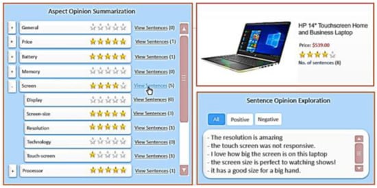 The advantages of our SEOpinion system are: (i) it helps users to easily access a sentiment score about any preferred aspect and all sub-aspects thereof; (ii) the extracted aspects do not depend on a specific domain (e.g., Amazon and Flipkart) as long as these aspects are directly extracted from the site templates; (iii) the extracted hierarchy of aspects is constant and does not change with the change of reviews as in other methods [18,19] because they have been obtained from product details, not from the reviews (as shown in step 1 of Figure 1); (iv) some users might prefer to read the actual opinion sentences instead of reading the overall statistics, so these are displayed in a separate panel called the opinion sentence exploration (the details are shown in Section 3.5); (v) it allows users to easily compare people’s opinions on products of the same type (e.g., cameras) because they are all represented by the same aspects (e.g., Zoom, Lens, and Focus); and finally (vi) it helps in the polarity classification processes, which show the polarities of some sentiment words. For example, the sentence “In this laptop, the processor and battery-life are fast” contains a sentiment word “fast” and the two aspects “processor” and “battery-life.” The “fast” is positive under the “processor” aspect node, while it is negative under “battery-life.”