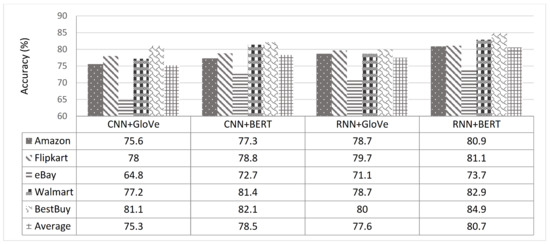 - Deep learning: CNN and RNN utilize word embedding as an input feature, in which the embedding is trained using random initialization, Global Vectors (GloVe) [42], and BERT embedding [5]. We used GloVe instead of Word2vec because it achieved better results [38]. The pre-train BERT word embedding [5] was used on the Amazon corpus.