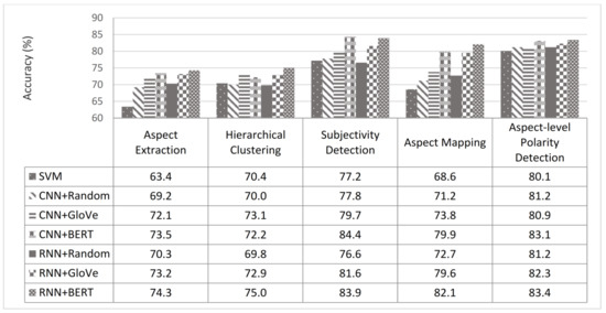 The main subtasks of sentiment classification are emotion identification [35], sentiment intensity prediction [36], and polarity detection [37]. Emotion identification detects the emotions behind sentiments such as anger or sadness. Predicting sentiment intensity seeks to identify the polarity degree (e.g., ‘good,’ ‘wonderful,’ and ‘awesome’). Furthermore, polarity detection classifies text as negative or positive. Hence, our system applies the polarity detection task to the aspect, which classifies polarity for each opinionated sentence based on the aspect that matches it. Polarity detection has been solved using different machine learning techniques [8,38]. Recently, DL techniques have achieved success in polarity detection [38], especially with the use of BERT embedding. Our work uses DL-based BERT representation, and the results showed that combination of BERT with DL methods worked well for this task [39].