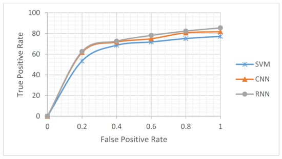 From another perspective, through an accuracy metric, we studied which text representations achieved the best results. The impact of the four different representations—namely the hand-crafted features [45], GloVe embeddings [42], random initialization embeddings, and BERT embeddings [5]—on our proposed approach was investigated. Figure 10 shows the performance of the four different representations on our LC5 dataset. The GloVe embedding and BERT embedding-based deep learning models (i.e., RNN and CNN) were studied and achieved the best results. Therefore, a comparison of the two words embedding-based DL models (i.e., CNN and RNN) on both phases revealed the average performance for each product website, as shown in Figure 11. As can be seen, the RNN-based BERT method had the highest accuracy among all websites, and the CNN based-GloVe method had the lowest accuracy among all websites. More generally, on both RNN and CNN, the BERT method increased the accuracy of the GloVe method by an approximate average of at least 3.1%. Additionally, the accuracy difference between GloVe embedding and BERT embedding increased when the volume of data grew, such as with the BestBuy, Amazon, and Walmart websites. To study the size of the data in depth, Figure 12 shows the overall picture of BERT embedding and GloVe embedding on the average of both phases. Note that the BERT embedding achieved the best results for large data sizes. In contrast, GloVe embedding had the best accuracy rates obtained for small data volumes. More generally, when studying the baseline model performance, we looked at the five tasks of our system (aspect extraction, hierarchical clustering, subjectivity detection, opinion mapping, and aspect level-polarity detection) separately. As shown in Figure 13, the BERT embedding-based two DL models provided a significant increase in accuracy metric over GloVe embedding while also being noticeably superior to other baselines on different tasks. Additionally, the aspect extraction and hierarchical clustering tasks were the least accurate in comparison to others due to the small amount of retrieved information from product template websites. Thus, our intention in the future is to try the proposed approach on another domain (movies or restaurants). Comparing the results in Table 5 and Table 6 reveals that BERT was an effective model for predicting sentiment in the LC5 dataset. In Figure 14, we compare the area under the ROC (Receiver Operating Characteristic) curve for the results of applying SVM, CNN, and RNN.