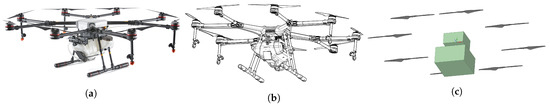 (a,b) show the UAV physical object and 3D model, respectively. (c) shows the simplified UAV model. The simplified UAV model consists of eight 2170 propellers, a control module shell, and a water tank.