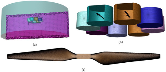 In accordance with the SST k– turbulence model, momentum, turbulent kinetic energy, and specific dispatch rate are all second-order upwind. In the 3D coordinates, the positive X−direction motion is forward, the positive Y−direction motion is the rise, and the positive Z−direction motion is the right offset. The UAV is located at the Y = 2 m plane, and its Y−direction projection point is the center of the plane (X = 0, Y = 0 m). As shown in Figure 2a, the whole calculation domain is a cylinder with a radius of 4.5 m and a height of 3 m. The size and position of UAV meshes refer to the real UAV settings in Figure 1a. As shown in Table 2, several regions are set up in the model to simulate the hovering state of UAV. The lift calculation and two-phase flow simulation are completed by using the sliding mesh method [59].