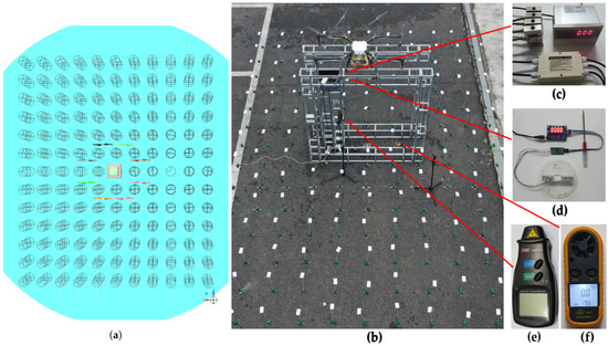 Data acquisition of lift and wind velocity. (a) shows the sample points in the simulation. (b) shows the scene in the experiment. (c–f) show the positive and negative force sensors of UAV’s landing gears, laser tachometer, and anemometer.
