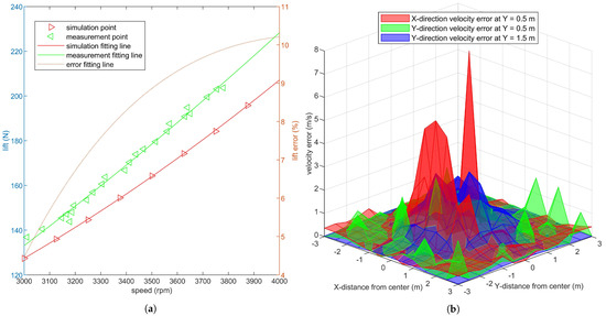 Lift curve and wind field error between the simulation and experiment. (a) shows the lift sample points and their fitting curves at different speeds and the error between the experiment and simulation. (b) shows the error of X−direction and Y−direction velocities at each sample point on Y = {0.5, 1.5 m} planes between the simulation and experiment.