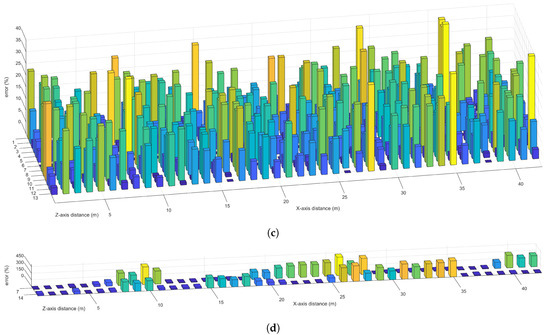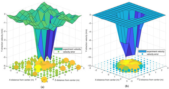The X−direction and Y−direction wind velocities of 429 sample points under 3500 rpm propeller are recorded to verify the realness of simulation wind field. The Y−direction wind velocity and its error figure of Y = {0.5, 1.5 m} sample planes are drawn, as shown in Figure 5a,b, respectively. Figure 4b shows the difference in wind velocity between the simulation and experiment, and different colors are used to indicate different heights and directions. The error is represented by the absolute value of wind velocity difference between the simulation and experiment.